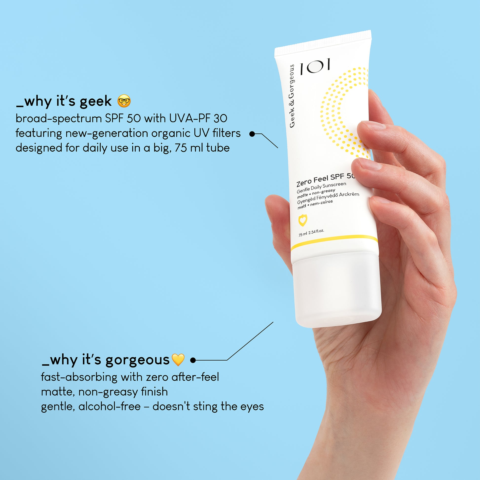 A gentle, zero after-feel daily sunscreen with new-generation organic UV filters. Its fast-absorbing formula leaves a matte, non-greasy finish & feels like nothing on the skin. Gives broad-spectrum SPF 50 and UVA-PF 30 protection. Does not sting the eyes.